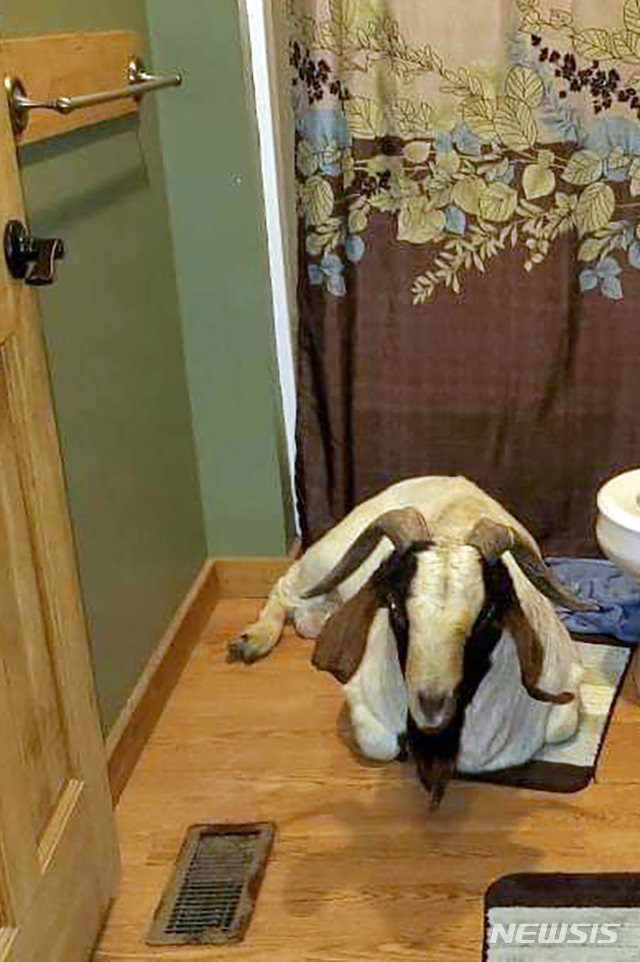 【설리번타운십=AP/뉴시스】지난 4일(현지시간) 미 오하이오주 설리번타운십의 한 가정집 욕실에 염소 한 마리가 들어와 엎드려 있다.