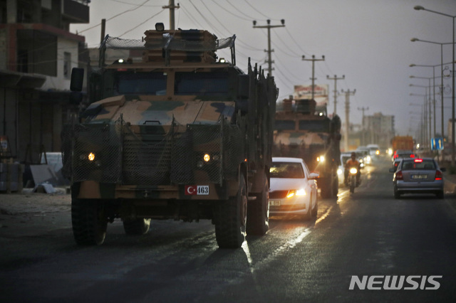 【아크카칼레=AP/뉴시스】9일(현지시간) 터키 국경마을인 아크카칼레에서 군용 운송차량들이 도심을 지나고 있다. 터키군이 이날 쿠르드족 자치 지역인 시리아 북동부에 대한 공격을 개시했다. 2019.10.10