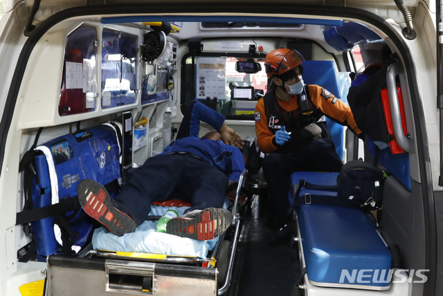 【서울=뉴시스】고승민 기자 = 11일 서울 여의도 국회에서 신원 미상의 한 남성이 휘발유를 음독한 뒤 119 대원들에게 실려나가고 있다. 2019.10.11.