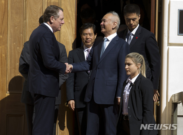 【워싱턴=AP/뉴시스】 미국과 중국이 이틀째 고위급 무역협상을 이어나가고 있다. 사진은 11일(현지시간) 미국 워싱턴 미 무역대표부(USTR)에서 만나 악수를 나누는 로버트 라이트하이저 미 무역대표부 대표(왼쪽)와 류허 중국 부총리(가운데)의 모습. 2019.10.12.