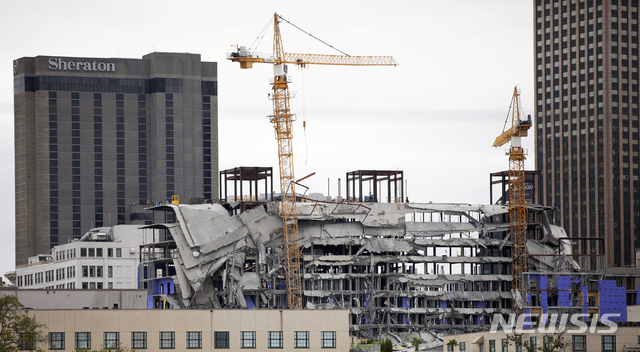 【뉴올리언스=AP/뉴시스】미국 남부 루이지애나주 뉴올리언스에서 신축 중인 하드록 호텔이 12일 갑작스레 무너지는 사고가 일어나 최소한 4명이 숨지거나 실종되는 참사를 빚었다. 지난 수개월 동안 공사를 진행해온 호텔 건물이 붕괴한 원인은 아직 확실하지 않다. 2019.10.13