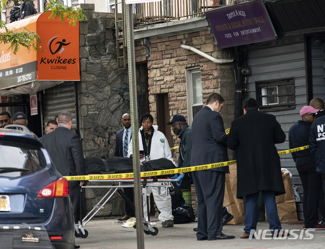 【뉴욕=AP/뉴시스】미국 뉴욕 브루클린 크라운 하이츠에 있는 불법도박장에서 12일(현지시간) 오전 7시 직전에 총격사건이 일어나 4명이 숨지고 3명이 다치는 참변을 빚었다. 2019.10.13
