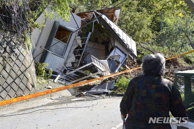 【사가미하라=AP/뉴시스】13일 일본 도쿄 인근 사가미하라에서 제19호 태풍 하기비스의 영향으로 산사태가 발생해 한 주민이 무너져내린 가옥을 바라보고 있다.
