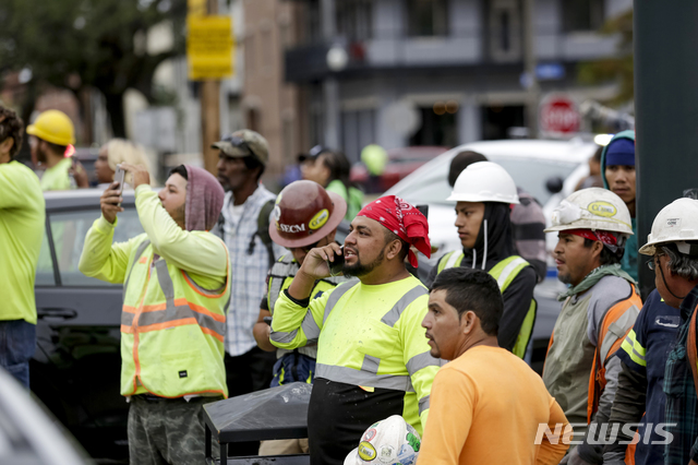 【뉴올리언스=AP/뉴시스】12일(현지시간) 미 루이지애나주 뉴올리언스에서 공사 중이던 하드록 호텔의 일부가 갑자기 무너져 대피한 작업자들이 붕괴 현장을 바라보고 있다.