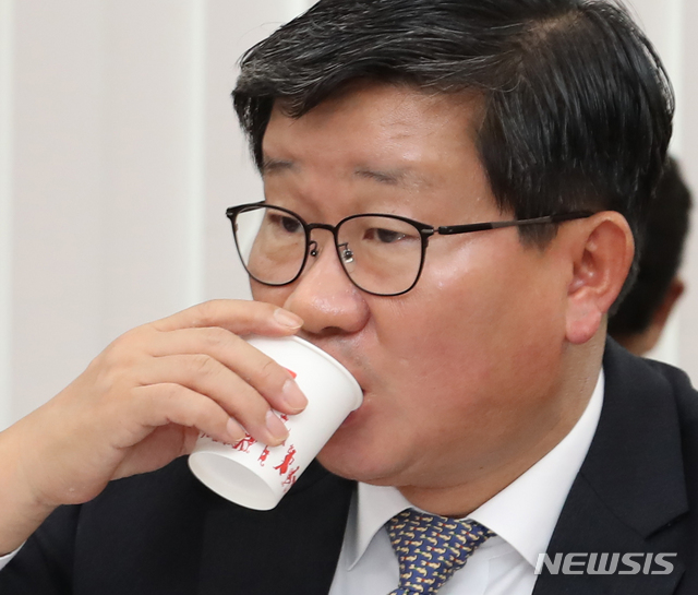 【서울=뉴시스】김명원 기자 = 전해철 더불어민주당 의원이 15일 오전 서울 여의도 국회 정무위원회에서 열린 한국자산관리공사 한국주택금융공사 신용보증기금 한국예탁결제원 국정감사에서 물을 마시고 있다. 2019.10.15.