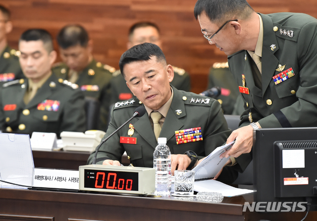 【화성=뉴시스】 김종택 기자 = 15일 오전 경기 화성시 해병대 사령부에서 열린 국회 국방위원회의 해병대 사령부에 대한 국정감사에서 이승도 해병대사령관이 자료를 살펴보고 있다. 2019.10.15.