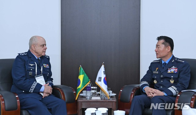 【서울=뉴시스】원인철 공군참모총장이 16일 경기도 성남 서울공항 서울 ADEX 2019 행사장 공군샬레에서 조세 마그누 헤센데 데 아라우주(Jose Magno Resende de Araujo) 브라질 공군작전사령관(대장)을 만나 양국 공군의 군사교류 강화 및 상호 협력 증진 방안을 논의하고 있다. 2019.10.16. (사진=공군 제공)