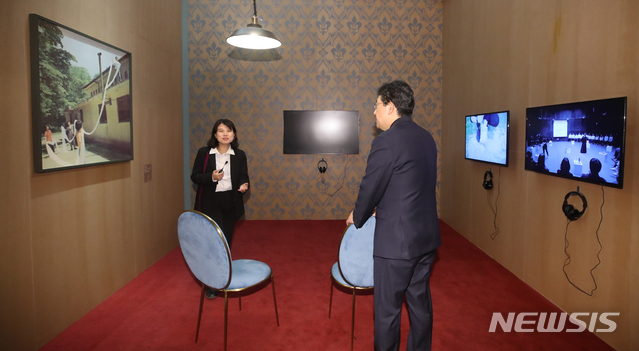 【과천=뉴시스】조수정 기자 = 박양우 문화체육관광부 장관이 16일 경기 과천시 국립현대미술관 과천관에서 열린 국립현대미술관 50주년 기념전 '광장:미술과 사회 1900-2019' 개막식 후 전시투어를 하며 강수정 학예연구관으로부터 박찬경 작가 작품 설명을 듣고 있다. 국립현대미술관 50주년 기념전 '광장:미술과 사회 1900-2019'는 한국 미술 100년을 조명한다. 덕수궁관과 서울관에서 2020년 2월9일까지, 과천관에서 2020년 3월 29일까지 열린다. 또 개관기념일인 10월 20일 덕수궁·과천·서울·청주 4관을 무료 개방한다. [email protected]