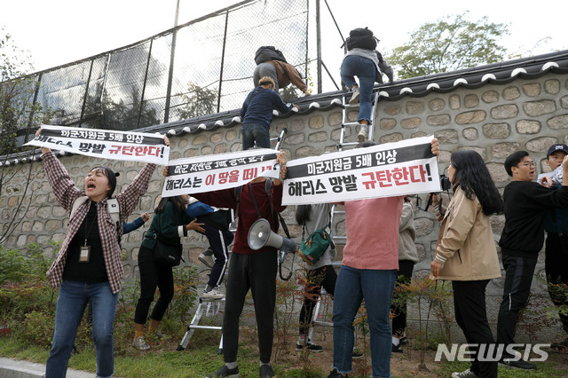 【서울=뉴시스】김선웅 기자 = 한국대학생진보연합 소속 대학생이 18일 오후 서울 중구 주한 미국대사관저에서 방위비분담금 협상 관련 기습 농성을 하기 위해 담벼락을 넘고 있다. 2019.10.18.