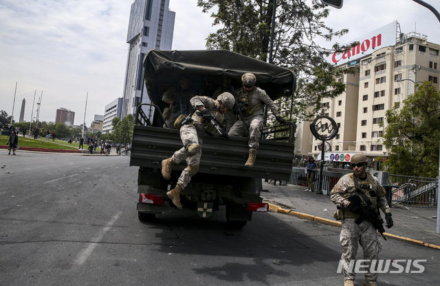 【산티아고=AP/뉴시스】19일(이하 현지시간) 칠레 수도 산티아고에서 시위가 벌어지는 가운데 칠레 군인들이 차량에서 하차하고 있다.