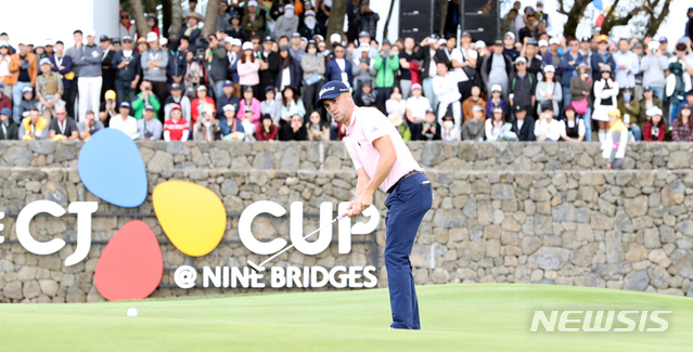 【제주=뉴시스】 전진환 기자 = 미국프로골프(PGA) 투어 정규대회 THE CJ CUP @ NINE BRIDGES가 열린 20일 오후 제주 서귀포시 클럽 나인브릿지에서 저스틴 토마스가 18번홀 어프로치샷을 하고 있다. 2019.10.20.