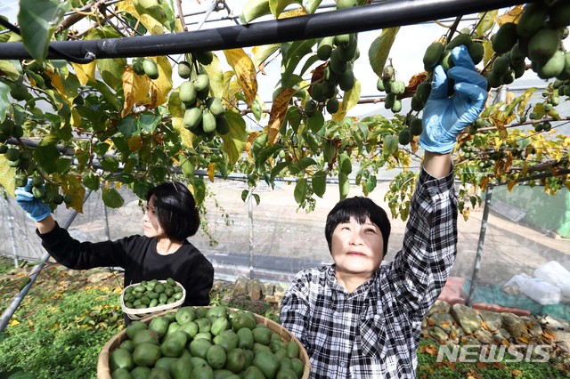 【서울=뉴시스】농민들이 22일 경남 사천시 실안동의 한 과수농가에서 농촌진흥청 국립원예특작과학원이 육성한 다래 '스키니그린' 품종을 수확하고 있다.