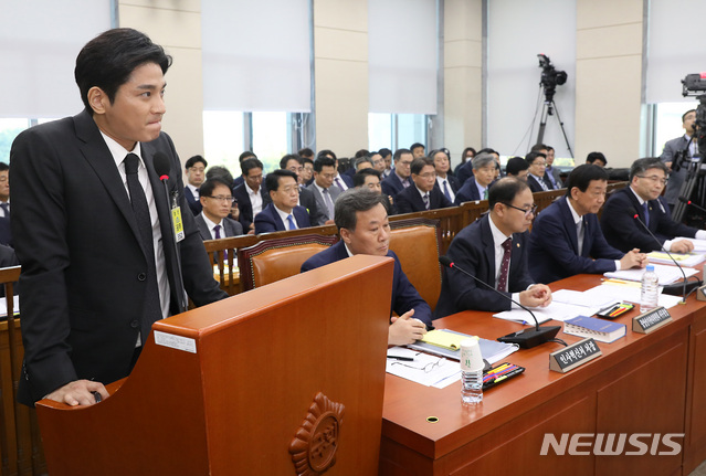 【서울=뉴시스】이종철 기자 = 행정안전위 참고인으로 출석한 '버닝썬' 사건 최초 신고자로 알려진 김상교씨가 24일 오후 서울 여의도 국회 행정안전위원회 종합 국정감사에서 심각한 표정을 하고 있다. 2019.10.24.