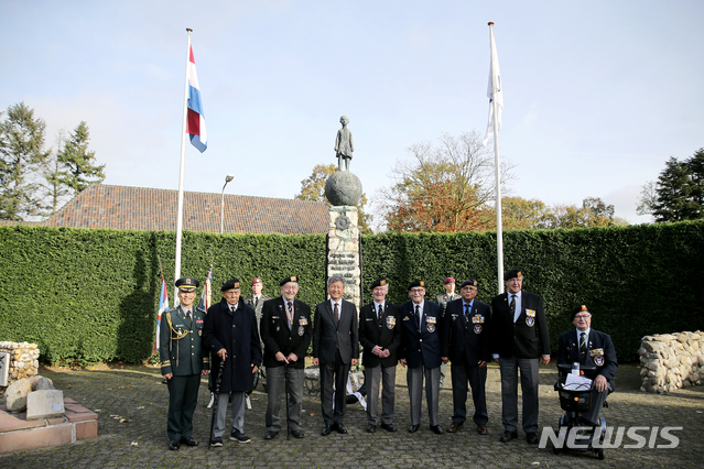 【서울=뉴시스】 김병문 기자 = 박삼득(왼쪽 네번째) 국가보훈처장이 25일(현지시간) 6·25 참전부대인 네덜란드 반호이츠부대를 방문해 관계자들과 기념촬영을 하고 있다. 2019.10.25.(사진=국가보훈처 제공)