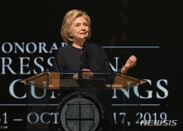 【볼티모어=AP/뉴시스】힐러리 클린턴 전 국무장관이 25일(현지시간) 메릴랜드주 볼티모어의 한 교회에서 열린 일라이자 커밍스 하원 정부감독개혁위원회 위원장의 장례식에 참석해 고인을 추모하고 있다.