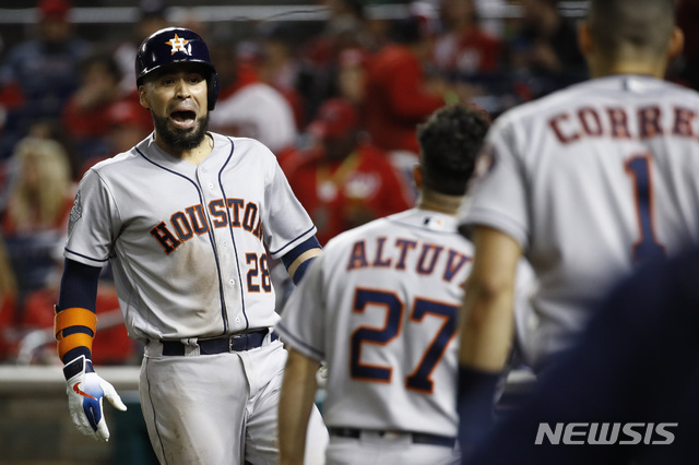 【워싱턴=AP/뉴시스】 로빈슨 치리노스(35·휴스턴 애스트로스)는 26일(한국시간) 미국 워싱턴의 내셔널스파크에서 열린 2019 메이저리그(MLB) 월드시리즈(7전 4선승제) 3차전에서 6회초 솔로 홈런을 터뜨렸다.