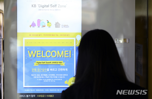 【서울=뉴시스】최진석 기자 = 28일 오후 서초구 KB국민은행 서울교대 디지털셀프점 디지털 셀프 존에서 한 고객이 은행 창구업무를 보고 있다. 2019.10.28. [email protected]