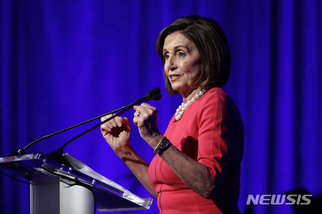 【필라델피아=AP/뉴시스】낸시 펠로시 미 하원의장이 1일(현지시간) 미 펜실베이니아주 필라델피아에서 열린 민주당 모금 행사에 참석해 연설하고 있다. 펠로시 의장은 앞서 한 언론과의 인터뷰에서 이달부터 트럼프 대통령 탄핵 조사 공개 청문회가 시작될 거로 예상한다고 밝혔다. 2019.11.02.
