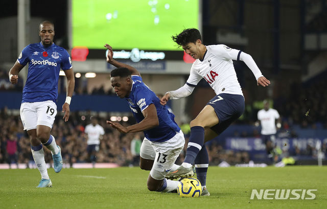 【리버풀=AP/뉴시스】토트넘 손흥민(오른쪽)이 3일(현지시간) 영국 리버풀 구디슨 파크에서 열린 2019-20 시즌 프리미어리그 11라운드 에버턴과  경기하고 있다. 손흥민은 후반 델리 알리의 선제골을 도우며 공격포인트를 올렸지만 후반 34분 거친 백태클로 퇴장당했다. 토트넘은 추가시간 동점 골을 내주며 1-1로 비겼다. 2019.11.04.