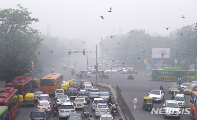 【뉴델리=AP/뉴시스】3일 오전(현지시간) 스모그가 짙은 인도 수도 뉴델리 의 교차로에서 자동차들이 신호를 기다리고 있다. 당국은 뉴델리의 유독성 스모그가 날로 심각해지면서 차량으로 인한 대기 오염을 줄이기 위해 '차량 2부제' 운행을 시행, 민간 차량의 도로 이용을 제한하고 있다. 2019.11.04.