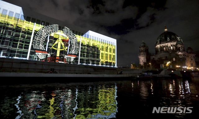 【베를린=AP/뉴시스】베를린 장벽 붕괴 30주년을 앞둔 4일(현지시간) 독일 베를린의 훔볼트 포룸 박물관 외벽에 독일민주공화국(GDR:구동독) 깃발의 일부가 영상으로 비치고 있다. 베를린 장벽은 1961년 동독 정부가 동베를린과 서방 3개국의 분할점령 지역인 서베를린 경계에 쌓은 콘크리트 담장으로 1989년 11월 9일 철거되고 약간의 기념물만 남겨졌다. 2019.11.05.