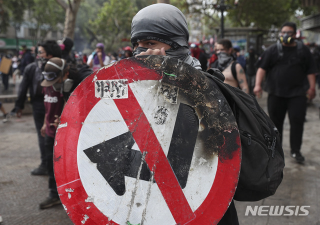【산티아고=AP/뉴시스】4일(현지시간) 칠레 수도 산티아고에서 반정부 시위를 벌이던 한 남성이 도로 표지판을 방패로 사용하고 있다. 이그나시오 브리오네스 재무장관은 이번 시위로 칠레의 경제성장률이 올해 예정했던 2.6%에서 2~2.2%로 하향조정됐다고 발표한 데 대해 시위대는 "어차피 우리는 칠레의 번영과는 무관한, 혜택받지 못하는 사람들"이라며 시위를 이어가고 있다. 2019.11.05.