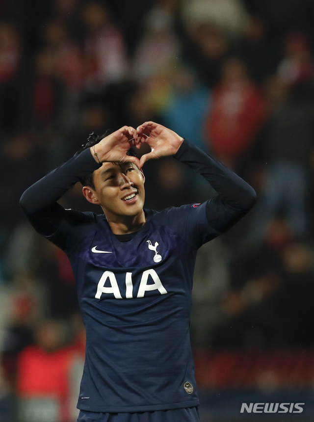 【베오그라드=AP/뉴시스】손흥민이 6일(현지시간) 세르비아 베오그라드의 라지코미틱 스타디움에서 열린 2019-20 유럽축구연맹(UEFA) 챔피언스리그 조별리그 B조 4차전 즈베즈다와의 경기 후반 팀의 두 번째 골을 넣고 세리머니를 하고 있다. 손흥민은 후반 12분과 16분 골을 터뜨려 토트넘의 4-0 승리에 기여했으며 차범근 전 감독의 기록(121골)을 넘어 한국인 유럽 무대 최다 골 신기록(122·123골)도 함께 세웠다. 2019.11.07.