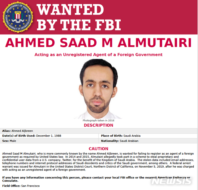 【워싱턴=AP/뉴시스】미연방수사국(FBI)은 7일(현지시간) 웹사이트를 통해  사우디 정부를 위해 간첩 활동을 벌인 혐의로 트위터 전 직원 알리 알자바라(사우디), 아흐마드 아보아모(미국)와 이들에게 간첩 활동을 하도록 지시한  아흐마드 알무타리(사우디)를 수배하는 전단을 공개했다. 미 검찰은 이들이 사우디 정부를 위해 반체제 인사 등 6천여 명의 트위터 계정 정보를 몰래 들여다보고 각종 첩보를 불법 수집한 혐의를 받고 있다고 밝혔다. 2019.11.08.