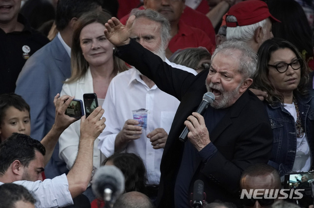 【쿠리치바(브라질)=AP/뉴시스】부패 혐의로 수감됐던 루이스 이나시오 룰라 다 시우바 브라질 전 대통령이 8일(현지시간) 석방돼 브라질 쿠리치바의 연방 경찰시설에서 나와 지지자들에게 연설하고 있다. 룰라 전 대통령은 브라질 연방대법원이 '재판의 유죄 판결만으로 피고인을 수감하는 것은 위헌'으로 판결하면서 석방됐다. 룰라 전 대통령은 뇌물 수수 등 혐의로 2017년 1심에서 9년 6개월, 2심에서 12년 1개월의 징역형을 선고받고 지난해 4월 쿠리치바 연방경찰 시설에 갇혔었다. 2019.11.09.