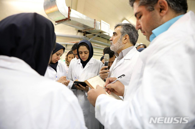 【테헤란=AP/뉴시스】9일(현지시간) 이란 테헤란 인근 포르도의 지하 핵시설에서 베흐루즈 카말반디 이란 원자력청(AEOI) 대변인(가운데)이 취재진의 질문에 답하고 있다. 2019.11.10