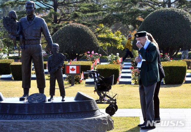 【부산=뉴시스】 하경민 기자 = 턴투워드부산 유엔참전용사 국제추모식이 열린 11일 오전 부산 남구 유엔기념공원에서 참전용사와 가족들이 전몰장병 묘역을 둘러보고 있다. 턴투워드부산 행사는 2007년 캐나다 참전용사 빈센트 커트니 씨가 6·25전쟁 참전 전사자들이 안장된 유엔기념공원이 있는 부산을 향해 묵념할 것을 제안한 이후 해마다 11월 11일 오전 11시 행사가 열리고 있다. 해외에서는 미국 등 참전 12개국에서도 동시에 이 추모행사를 열고 있다. 2019.11.11.