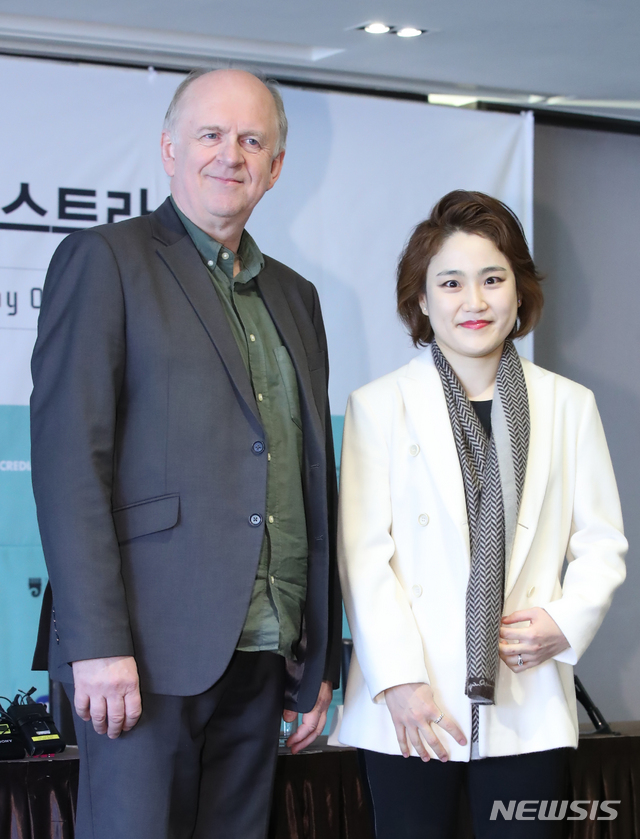 【서울=뉴시스】조수정 기자 = 11일 오후 서울 소공동 더플라자호텔에서 열린 '장한나&트론헤임 심포니 오케스트라' 기자간담회에서 트론헤임 오케스트라 장한나(오른쪽) 상임지휘자 겸 예술감독과 로아르 라이난 대표가 포즈를 취하고 있다. 2019.11.11. [email protected]