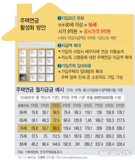 【서울=뉴시스】정부는 주택연금 가입연령을 기존 만 60세에서 55세로 낮춰 가입 대상을 확대하기로 했다. 이와 함께 취약 고령층에 대한 주택연금 지급액을 확대하고, 배우자 수급권도 강화하기로 했다. (그래픽=안지혜 기자)