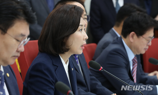 【서울=뉴시스】김명원 기자 = 나경원 자유한국당 원내대표가 13일 오전 서울 여의도 국회 자유한국당 원내대표실에서 열린 원내대표-중진의원 회의에 참석해 현안 관련 모두 발언을 하고 있다. 2019.11.13.