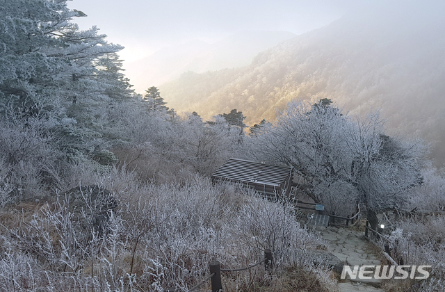 【산청=뉴시스】 정경규 기자 = 2020대학수학능력시험일인 14일 경남 산청 지리산 장터목 대피소에 상고대가 연출, 장관을 이루고 있다.이날 지리산 아침 최저기온은 영하7도, 최대 풍속 10m/s을 기록했다. (사진=지리산국립공원경남사무소 제공). 2019.11.14.