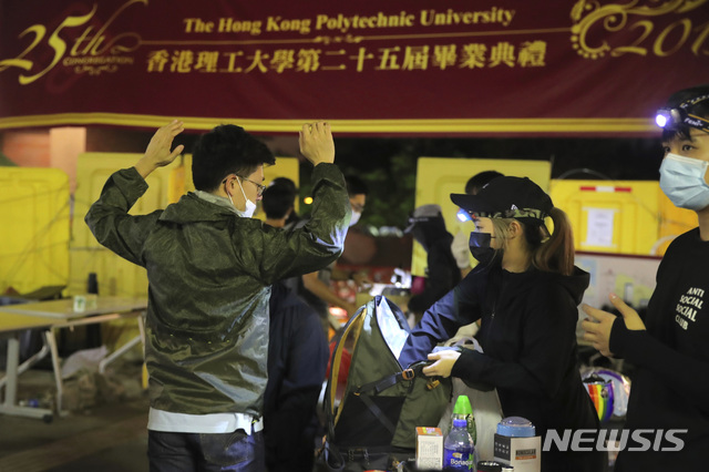 개인 소지품 검색하는 홍콩 폴리테크닉 대학 점거 시위대