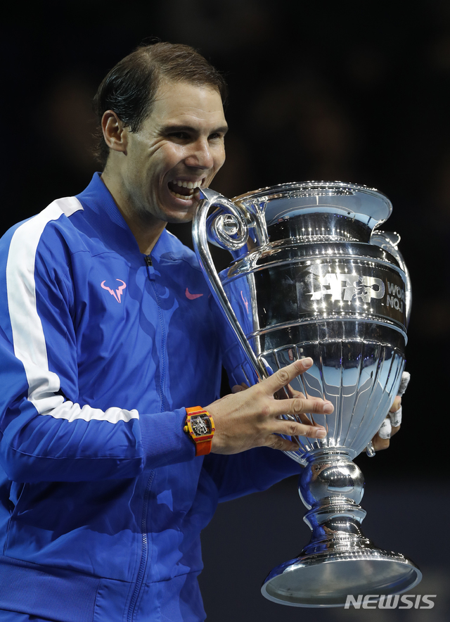 【런던=AP/뉴시스】라파엘 나달(1위·스페인)이 15일(현지시간) 영국 런던의 오투(O2) 아레나에서 남자프로테니스(ATP) 투어 2019시즌 마지막 대회인 니토 ATP 파이널스 조별 리그 3차전 스테파노스 치치파스(6위·그리스)를 물리치고 세계 1위를 확정하며 받은 트로피를 깨물고 있다. 나달은 치치파스에 세트스코어 2-1(6-7<4-7> 6-4 7-5)로 승리했지만 조3위에 머물며 준결승 진출에는 실패했다. 나달은 이번 대회 결과로 올해 연말 세계 1위 자리를 확정하며 역대 최고령 연말 1위가 됐다. 2019.11.16.