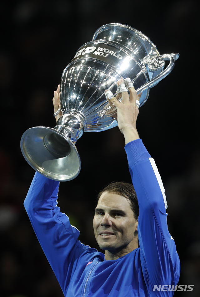 【런던=AP/뉴시스】라파엘 나달(1위·스페인)이 15일(현지시간) 영국 런던의 오투(O2) 아레나에서 남자프로테니스(ATP) 투어 2019시즌 마지막 대회인 니토 ATP 파이널스 조별 리그 3차전 스테파노스 치치파스(6위·그리스)를 물리치고 세계 1위를 확정하며 트로피를 받아 들고 포즈를 취하고 있다. 나달은 치치파스에 세트스코어 2-1(6-7<4-7> 6-4 7-5)로 승리했지만 조3위에 머물며 준결승 진출에는 실패했다. 나달은 이번 대회 결과로 올해 연말 세계 1위 자리를 확정하며 역대 최고령 연말 1위가 됐다. 2019.11.16.