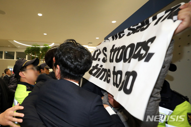 【인천공항=뉴시스】박미소 기자 = 제임스 드하트 미국 방위비협상대표가 17일 오후 인천국제공항 제2여객터미널을 통해 입국하는 가운데 한 시민사회단체 관계자가 방위비 분담금 인상을 규탄 시위를 벌이다 경찰에 제지 당하고 있다.2019.11.17.