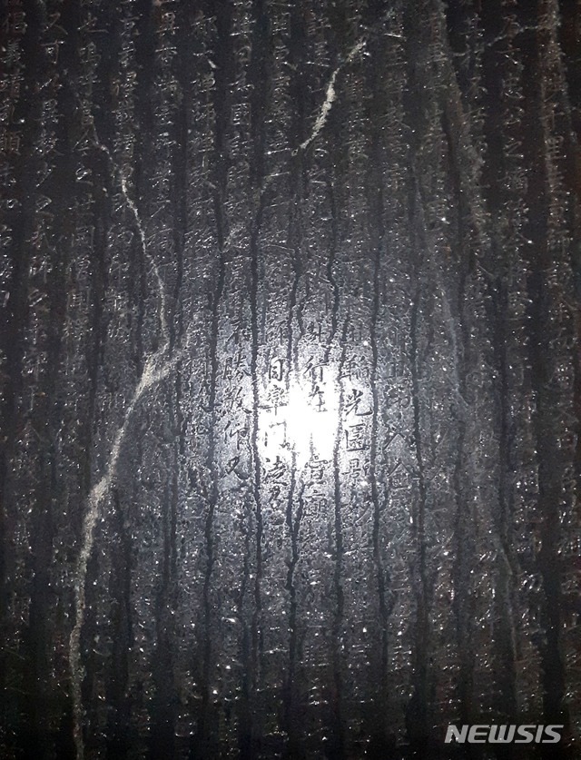 [밀양=뉴시스]안지율 기자 = 우리나라에 길흉사 등 중대한 일이 생길 때마다 땀이 흐르는 경남 밀양시 무안면 홍제사 경내 표충비가 18일 오전 4시부터 9시까지 1ℓ가량의 땀이 흐르고 있다. (사진=밀양시 제공) 2019.11.18.