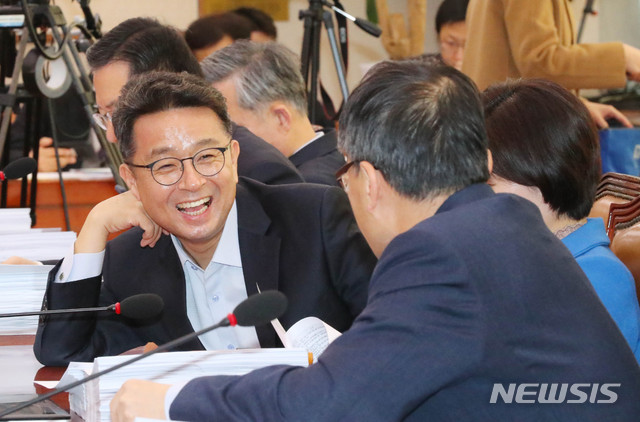 [서울=뉴시스] 장세영 기자 = 이철희 (왼쪽)더불어민주당 의원이 19일 오전 서울 여의도 국회에서 열린 법제사법위원회 전체회의에 참석해 박주민 의원과 이야기를 나누고 있다. 2019.11.19.
