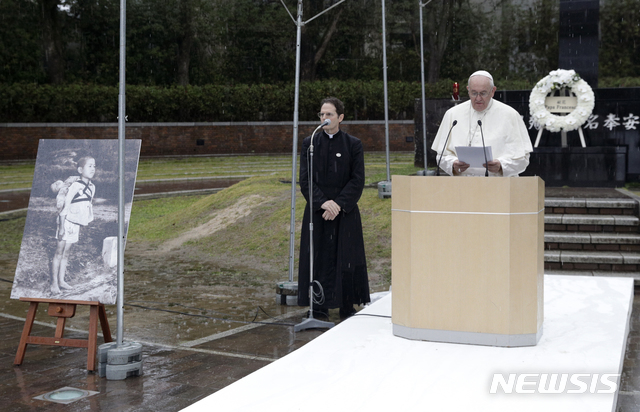 [나가사키=AP/뉴시스] 교황 프란치스코가 24일 일본 나가사키 폭심지에 세워진 공원에서 핵무기 폐기를 호소하는 연설을 하고 있다. 왼쪽 흑백사진은 나가사키 원폭투하 후 어린 소년이 사망한 동생을 업고 있는 모습을 담은 것이다. 2019.11.24