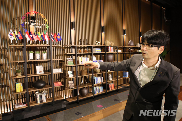 [부산=뉴시스]박영태 기자 = 25일부터 부산에서 열리고 있는 '2019 한·아세안 특별정상회의 및 제1차 한·메콩 정상회의'의 만찬이 열리는 H호텔의 영접 장소에 각국 정상들이 잠시 머물게 되는 휴식장소가 공개 되고 있다. 각국의 정상들이 추천한 책들과 전통 기념품등을 탁현민 청와대 행사 기획자문위원이 설명하고 있다. 2019.11.25.