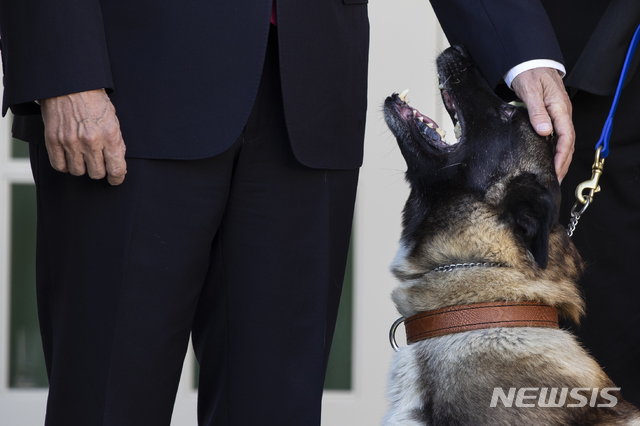 [워싱턴=AP/뉴시스]25일(현지시간) 마이크 펜스 미 부통령이 백악관 로즈가든에 초대된 '알바그다디 제압 작전' 투입 군견 '코넌'을 쓰다듬고 있다. 코넌은 지난달 26일 IS 수괴 알바그다디 제압 작전 당시 막다른 골목까지 그를 쫓았으며 이 과정에서 상처를 입었으나 현재 회복한 상태로 알려졌다. 트럼프 대통령은 이날 코넌을 직접 만나 "바로 지금, 아마도 세상에서 가장 유명한 개일 것"이라며 "코넌을 이 자리에 데려와 상을 주게 돼 영광"이라고 강조했다. 2019.11.26.