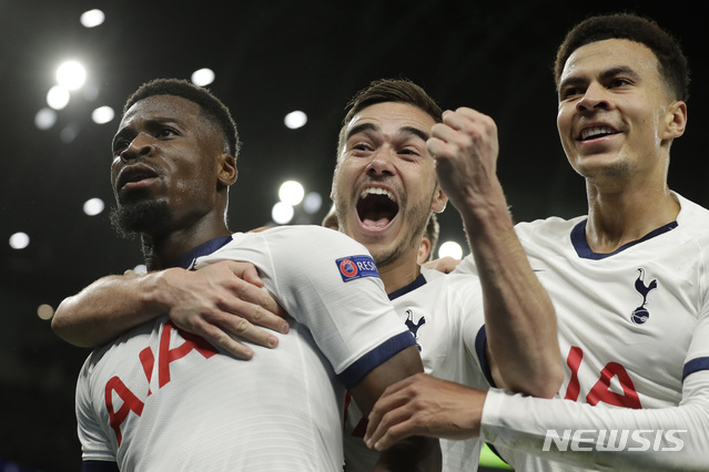 [런던=AP/뉴시스]토트넘 세르주 오리에(왼쪽)가 26일(현지시간) 영국 런던의 토트넘 홋스퍼 스타디움에서 열린 2019-20 UEFA 챔피언스리그 조별리그 B조 5차전 올림피아코스(그리스)와의 경기 중 손흥민의 도움으로 역전 결승 골을 넣고 동료들과 환호하고 있다. 손흥민은 풀타임을 소화하며 토트넘의 4-2 승리를 견인했다. 토트넘은 바이에른 뮌헨(독일·승점 15)에 이어 조 2위(승점 10)를 굳히며 16강 진출을 확정했다. 2019.11.27.