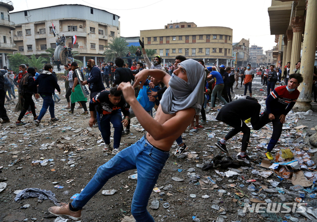 [바그다드=AP/뉴시스] 28일(현지시간) 이라크 수도 바그다드에서 시위대가 보안군에 돌을 던지고 있다. 이라크 보안군이 반정부 시위대에 발포하면서 이날 하루에만 최소 45명이 숨진 것으로 알려졌다. 2019.11.29