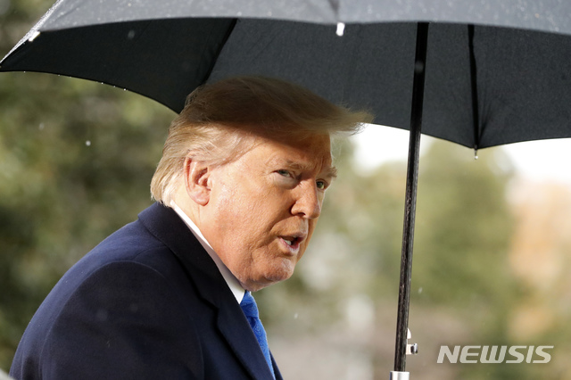 [워싱턴=AP/뉴시스]도널드 트럼프 미국 대통령이 2일(현지시간) 나토(북대서양조약기구·NATO) 정상회의 참석차 영국 런던으로 떠나기 전 백악관 사우스론에서 기자들과 만나 얘기하고 있다. 2019.12.3.