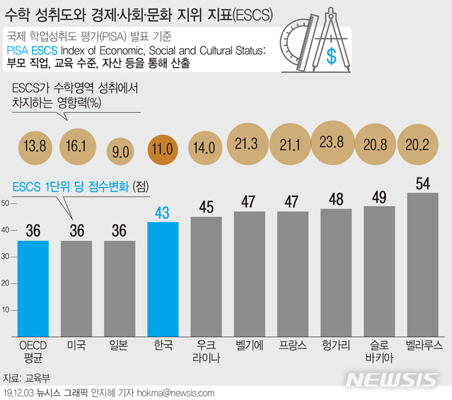 [서울=뉴시스OECD가 3일 부모의 경제·사회·문화 지위 지표(ESCS)에 따른 영향력 분석 자료를 공개했다. 우리나라는 수학영역에서 ESCS 1단위 당 성취도 점수 변화는 43점이었다. 부모의 사회·경제적 배경 단위가 1계단 올라갈수록 학생들의 학업성취도가 43점 향상된다는 의미다. (그래픽=안지혜 기자)