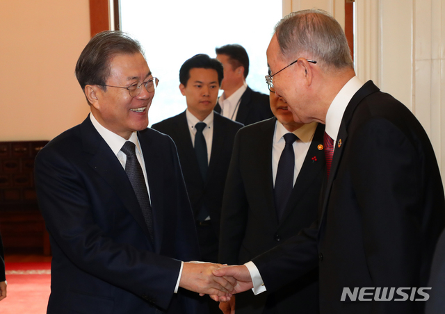 [서울=뉴시스]배훈식 기자 = 문재인 대통령이 3일 청와대에서 열린 국가기후환경회의 격려 오찬에 참석해 반기문 위원장과 악수하고 있다. 2019.12.03.
