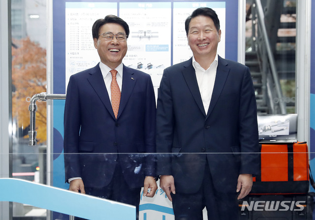 [서울=뉴시스]최동준 기자 = 최정우(왼쪽) 포스코 회장, 최태원 SK 회장이 3일 서울 강남구 포스코센터에서 열린 '2019 기업시민 포스코 성과공유의 장' 행사에서 기념촬영을 하고 있다. 2019.12.03.